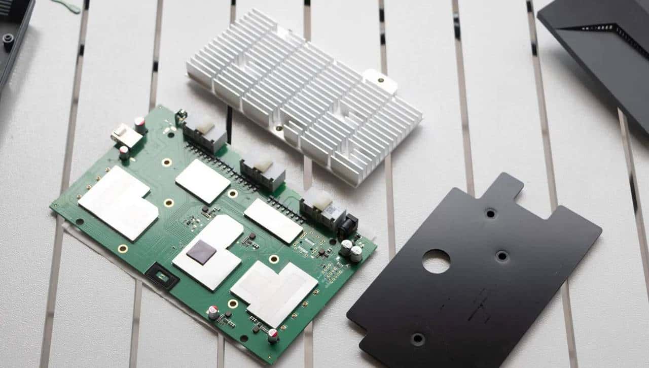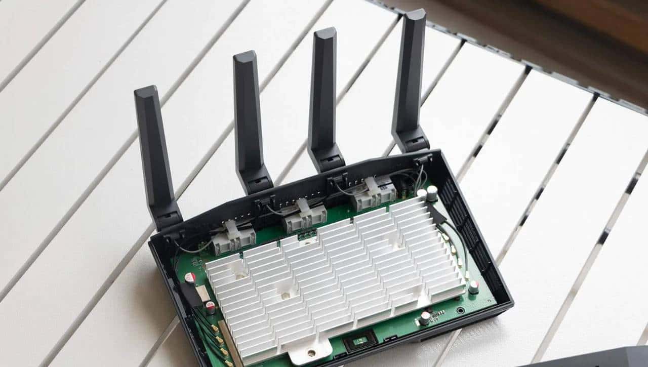 顶盖以卡扣形式相连,轻轻撬开就行,切勿大力出奇迹;一眼可以看到主板上覆盖有一块巨大的被动散热片,主要重量也是来源于此;内部走线整齐,甚至有集线器把天线捆合起来避免凌乱。