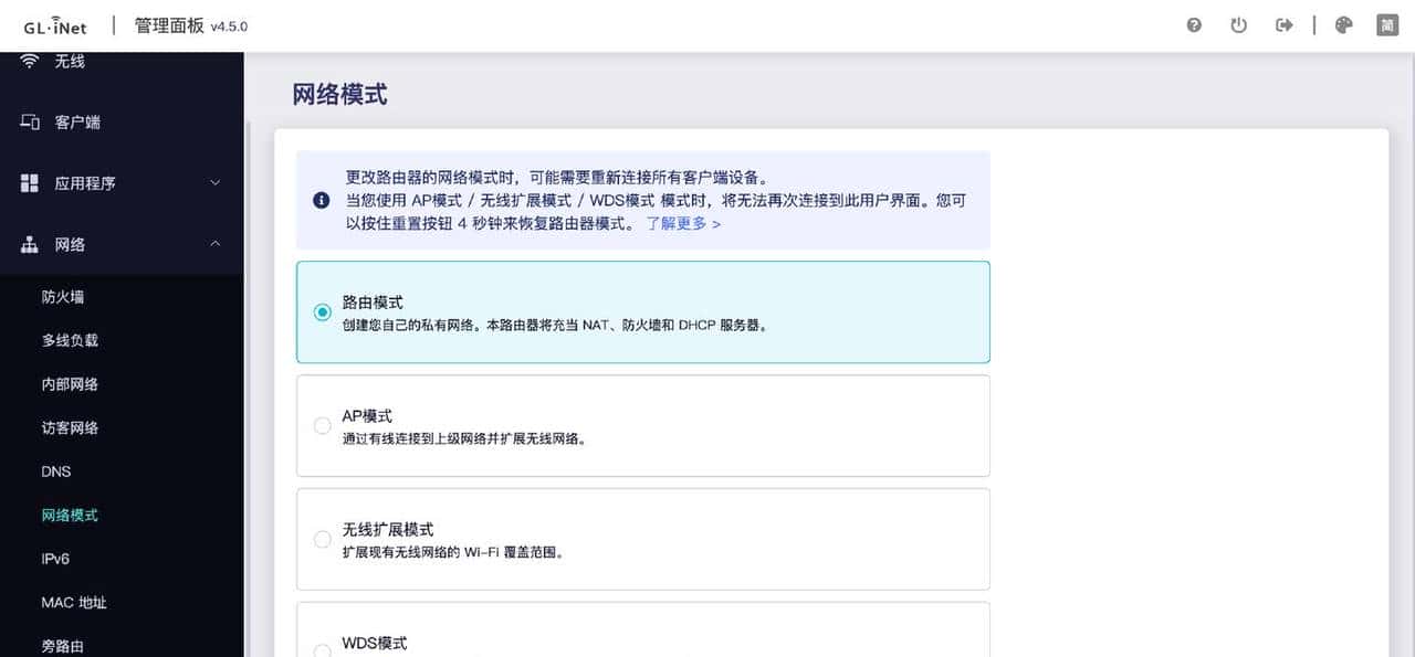 MT6000路由器可以看成是软路由+硬路由的结合体,同样提供了主流的网络模式可供选择,列如路由模式、AP模式、无线扩展模式、WDS模式等等。
