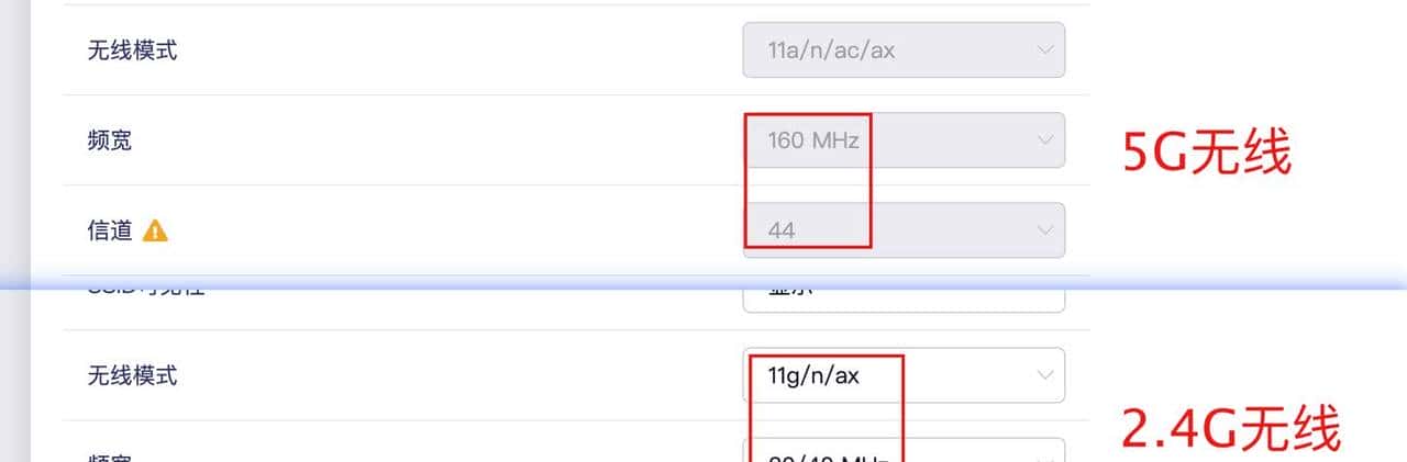 5G频段保持44信道并开启160MHz频宽,2.4G频段保持11信道,频宽为20/40MHz自动。