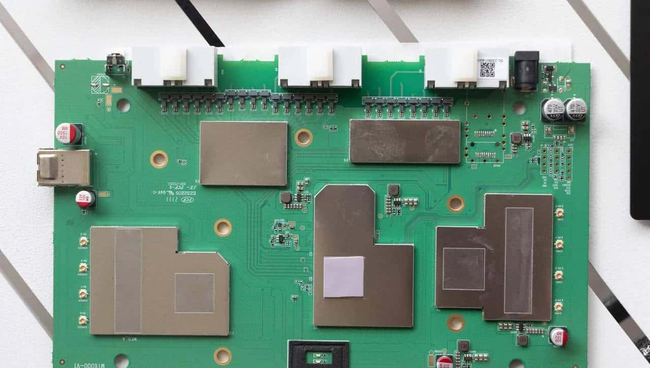 GL-MT6000路由器整机重量达到了761克,拿在手上份量还是很足的。下面来拆机来看看内部;路由器的做工、用料决定了路由器的稳定性。拆机超级简单,移除底部脚垫,使用常规十字螺丝可拆除。
