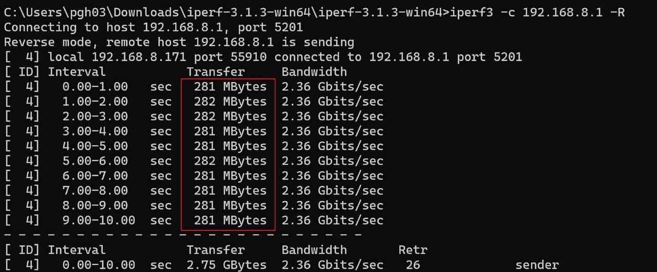 可能有朋友会关心双2.5G网口的极限速率,这里通过网线和2.5G LAN连接,在MT6000中安装iperf3进行带宽测试,结果如下,均有280MB即约2.36Gbps左右速度,没跑满2.5G速率可能是工程机的缘故,后续正式版固件可能会有优化提升。