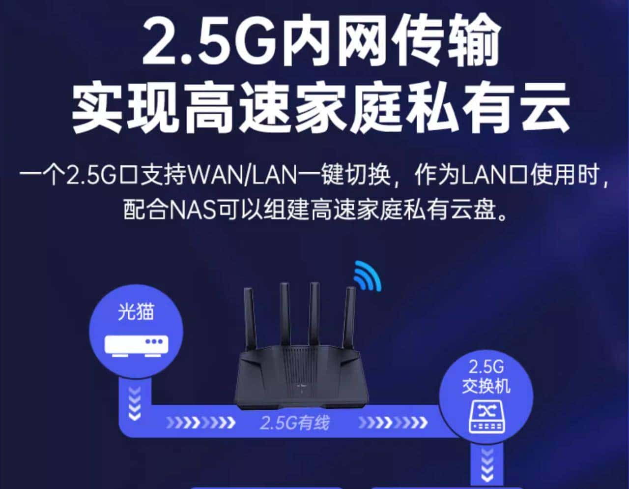 - 网口:双2.5G网口+4个千兆网口,WAN/LAN可随意切换