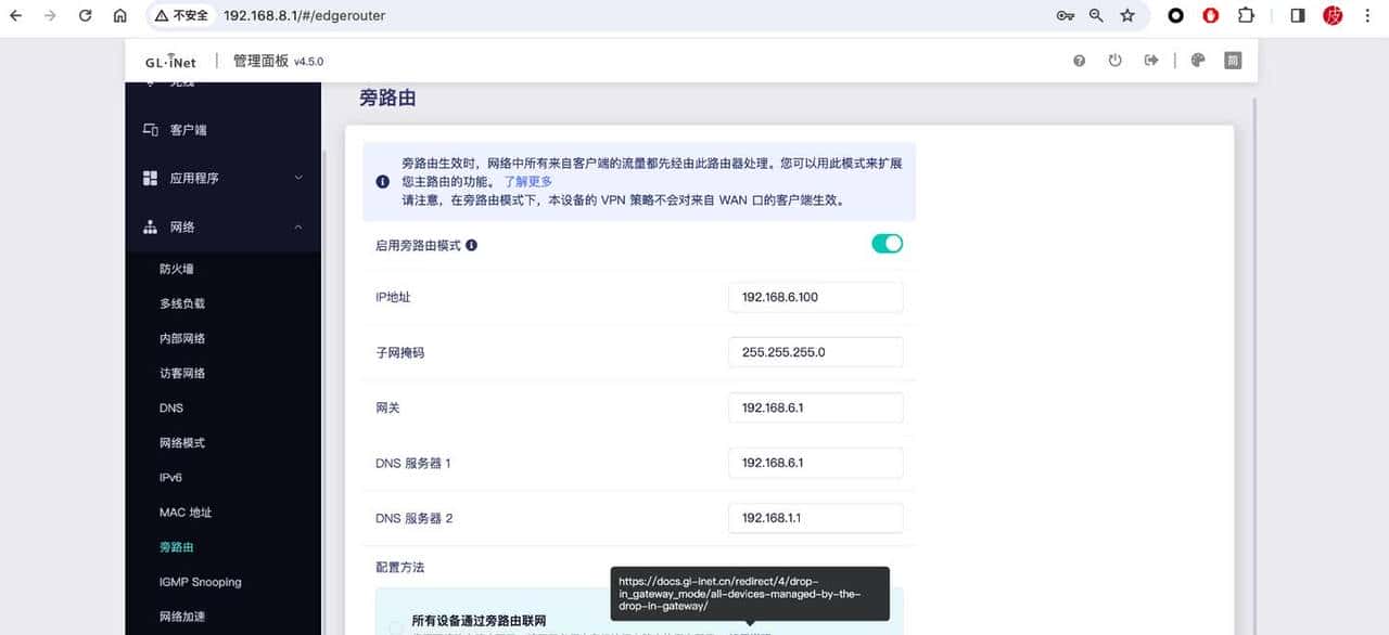 从4.1版本固件起就引入了旁路由功能,可以在不改变现有网络架构的情况下引入MT6000,借助旁路由模式,可以使用到MT6000的各种功能、各种插件,只要设备流量经过MT6000,就相当于使用软路由了;