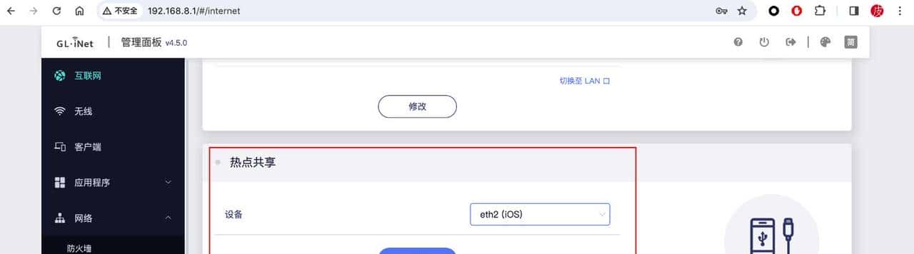 值得一提的是『热点共享』联网方式,这算是GL.iNet路由器的一大特色,本质上也是集成并简化了OpenWRT下的RNDIS驱动的使用,继而可以通过USB数据线和手机连接,让手机提供网络支持,实测支持IOS和安卓,仅需要手机中开启热点共享即可。