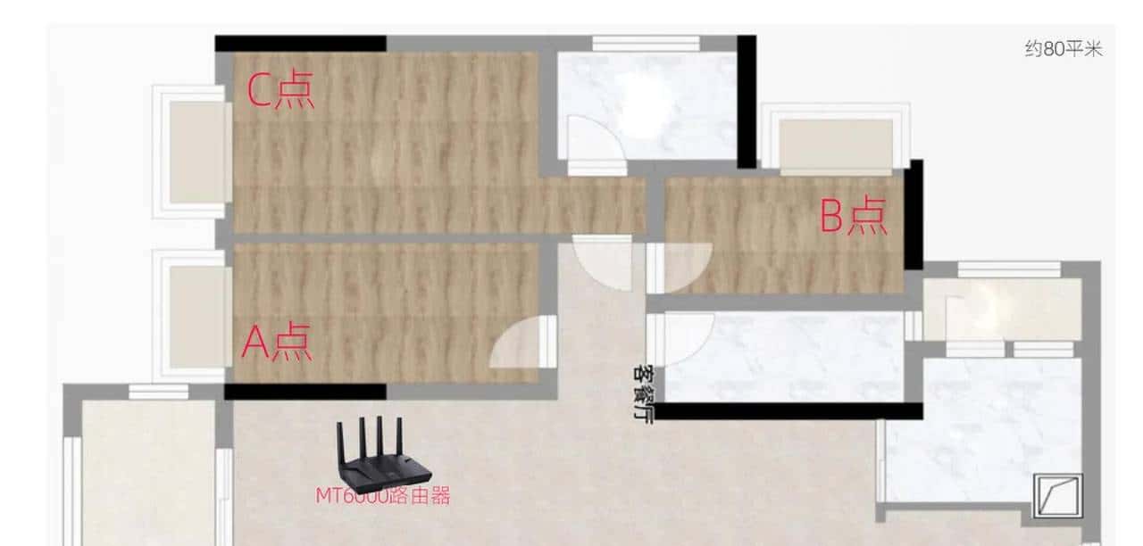 下面进行无线速度测试,自建Speedtest测速服务器,户型图如下,约80平米左右,在A、B、C三点分别测试5G频段上下行、在C点增加2.4G频段速度测试,2.4G主要是智能家居使用,所以只测了C这个远点。