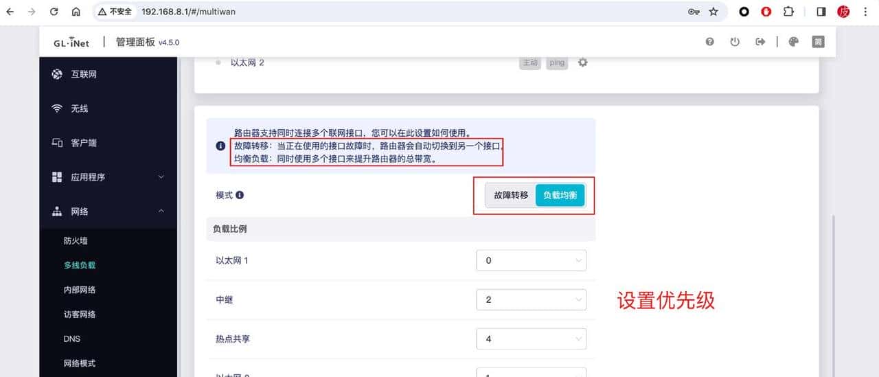 当然,和双WAN一样,中继和热点共享的联网方式同样适用于故障转移和负载均衡模式。