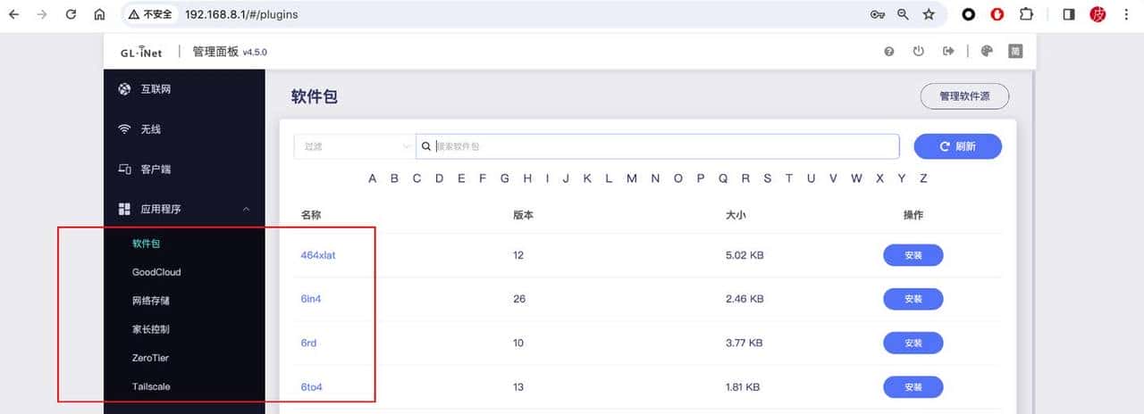 除了常规路由器功能外,自带固件也提供了许多好用的功能,例如在应用程序一栏,提供了软件包功能,可以在这里搜索并一键安装需要的插件,将原生OpenWRT复杂的安装插件流程和界面进行了简化。