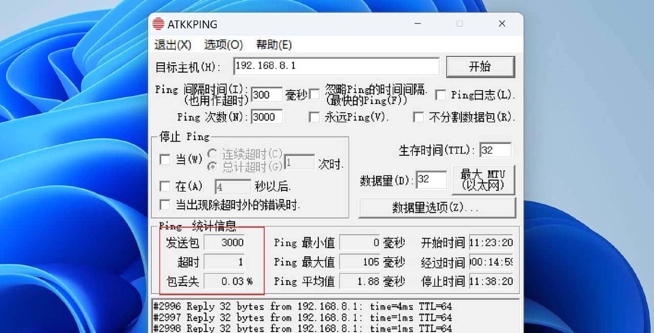 目前有大约不到20台设备连接MT6000的情况下进行网络丢包测试,使用的工具是ATTKPING,对MT6000发起3000次Ping包测试;仅丢包一次,并且Ping平均值在1.88毫秒,结果还不错。