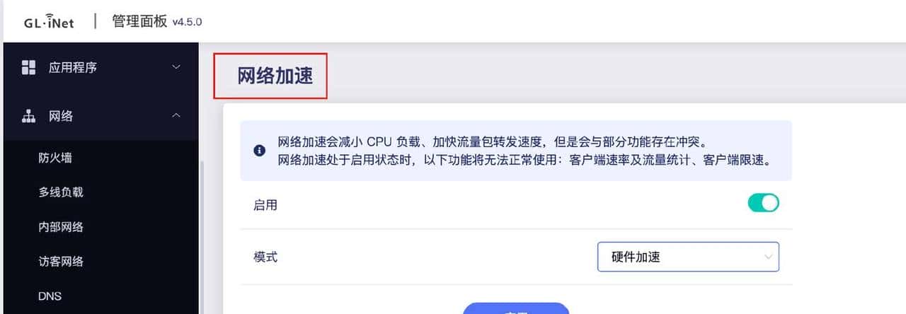 常规的软路由的小包转发性能很差,Filogic 830是支持硬件加速的,可以有效提升包转发性能,仅需在网络-网络加速中开启硬件加速即可,不过开启后会影响到客户端速率及流量统计、客户端限速功能,如果日常没用到以上功能,提议开启网络加速,在游戏时会带来更好体验。