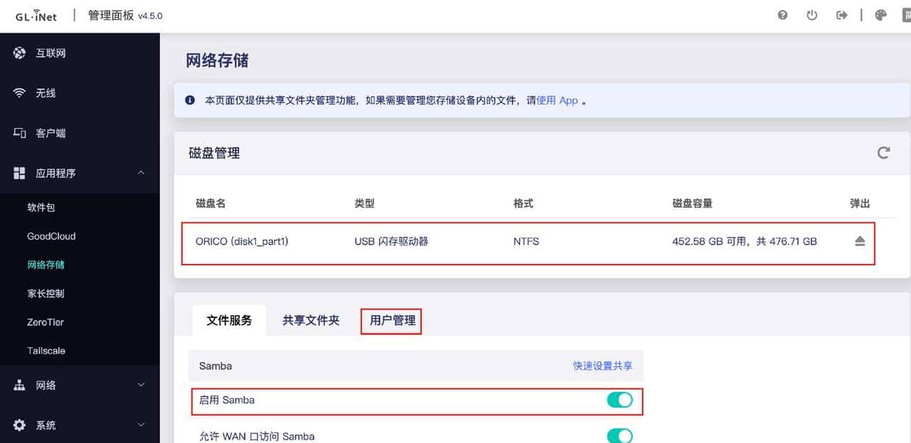 然后在路由器后台的『网络存储』功能中就可以看到接入的硬盘,第一在用户管理中添加一个用户,然后开启Samba共享,设置有权限读写硬盘的用户就完成了SMB共享;此外,也支持DLAN、Wedav等功能,请按需设置。