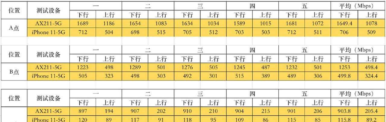 使用一台搭载AX211 WiFi 6E(支持160MHz、2×2 MIMO)无线网卡的电脑和iPhoen 11进行测试;