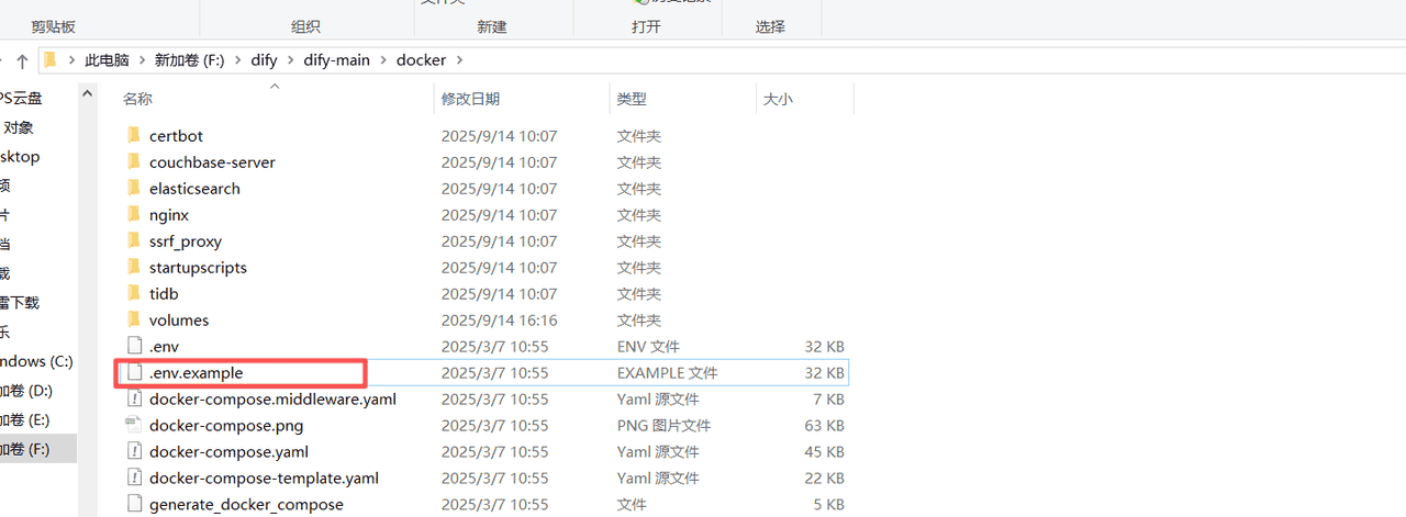 3.进入到dify安装目录下docker文件夹下,找到env.example ,将其名称改为env.example