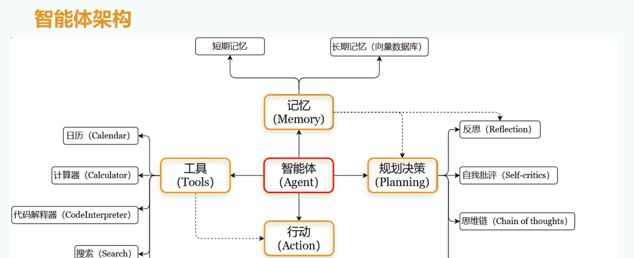 规划决策:通过任务分解,反思与自省框架实现复杂任务处理。例如,利用思维链(chain of thought) 将目标拆解为子任务,并通过反馈优化策略。