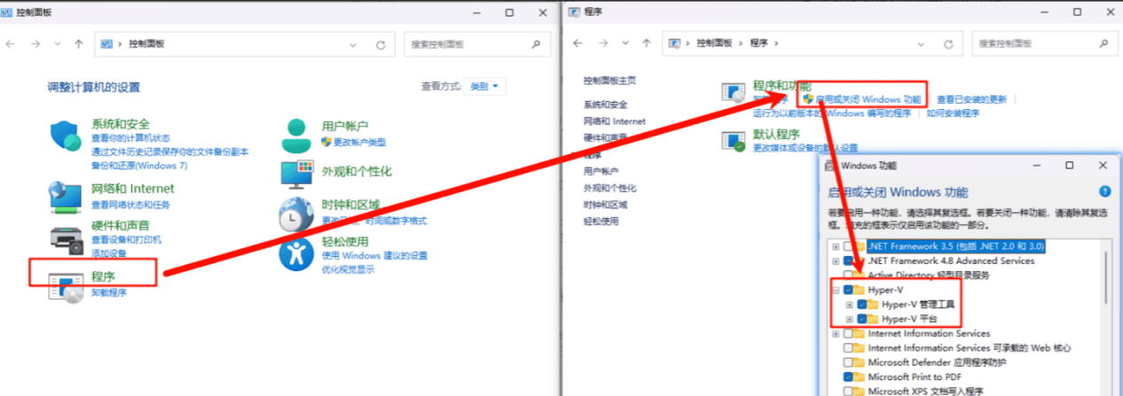 2.开启以后重启电脑,打开控制面板按照下图操作选择即可,应该需要安装并重启电脑才生效