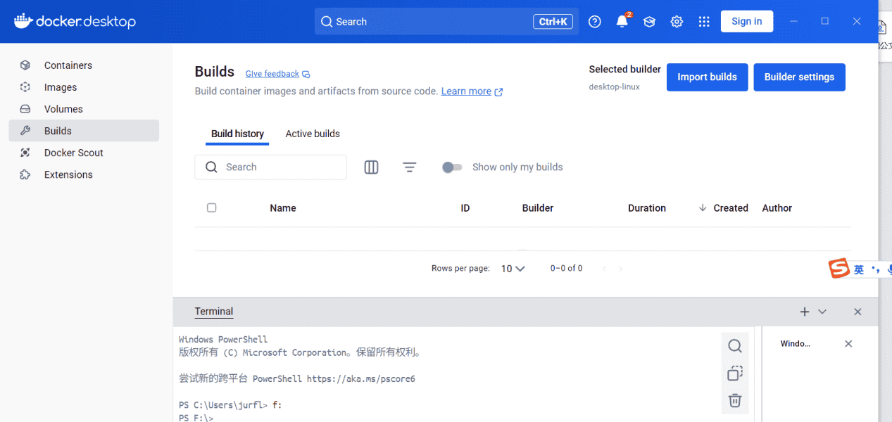 在windows powershell中跳转到docker的安装路径,这里是F:docker-desktop,然后运行命令【.DockerCli.exe -SwitchDaemon】 把docker dameon启动。