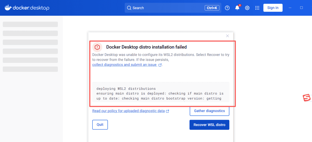 3.如果报这样wsl的错误,选择下面的按钮【recocer wsl distro】