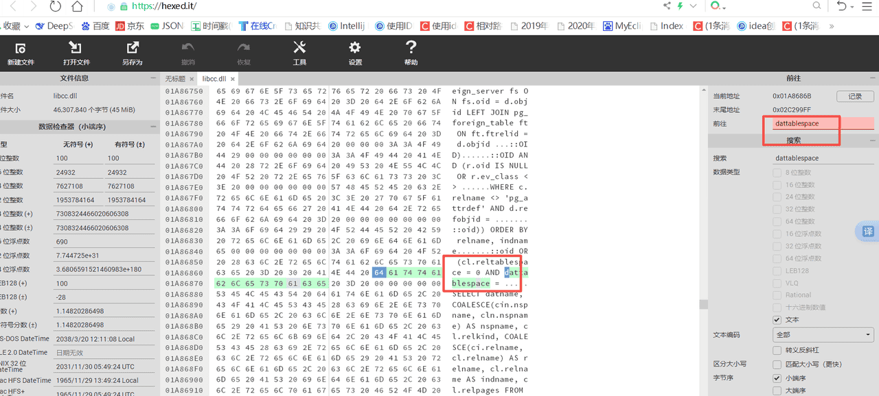 3.进入网站https://hexed.it/ 打开本地的libcc.dll 文件,.右侧点击搜索,关键词“SELECT DISTINCT datlastsysoid”