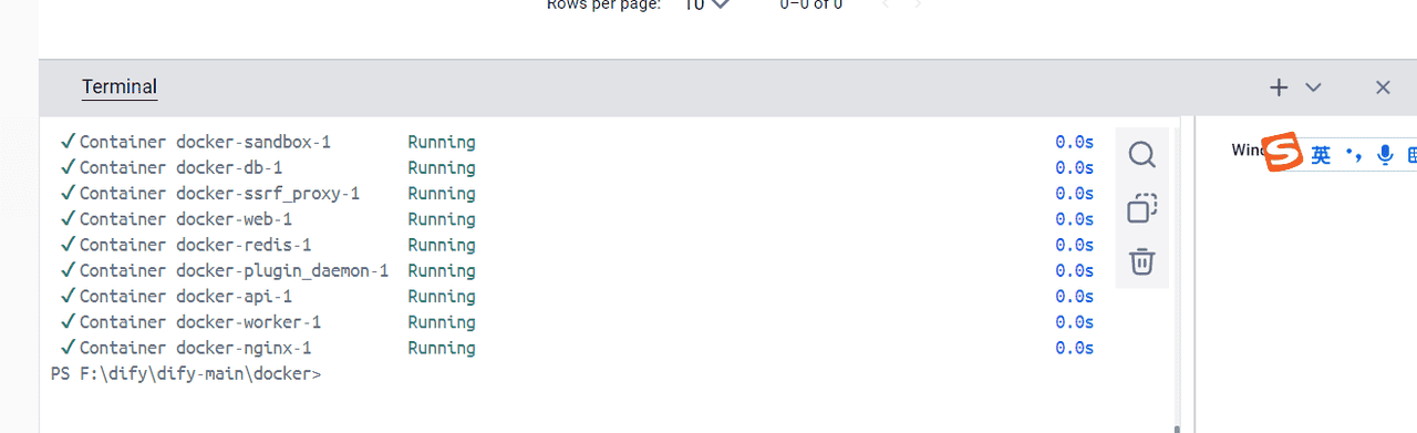 5.启动dify:在docker-desktop页面进入terminal,进入到dify的安装目录(F:difydify-maindocker)的docker目录下,执行命令: