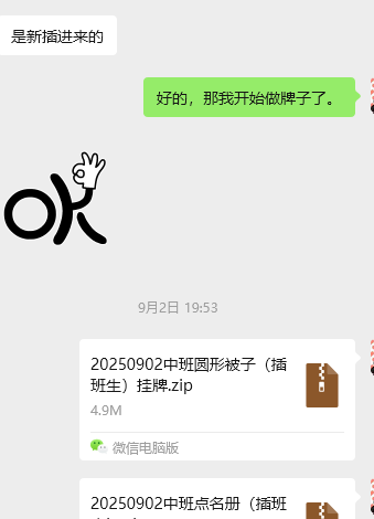 20250902因为中班有插班生,所以中班组长要了被子园卡和点名册。应该是在中班组里群发了。