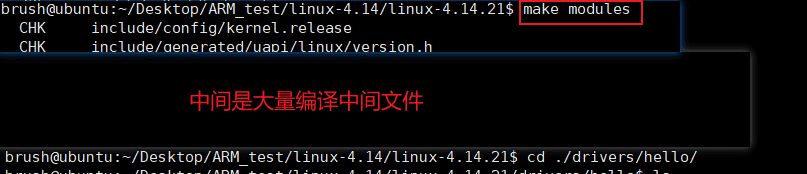 编译 hello 模块,linux-4.14.12/目录(源码根目录)执行make modules,在drivers的hello文件下生成hello.ko【执行时间长,会把所有M模块都编译一次】