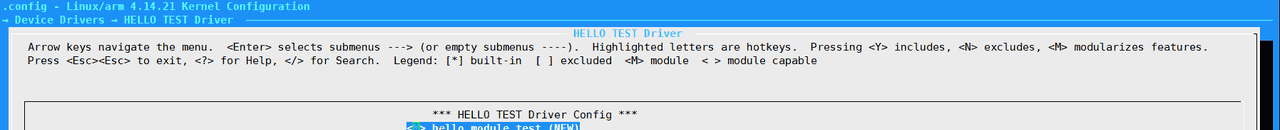 在make menuconfig中配置hello为【M】模式;【可以选择 ,分别为编译成内核模块、编译进内核、不编译】