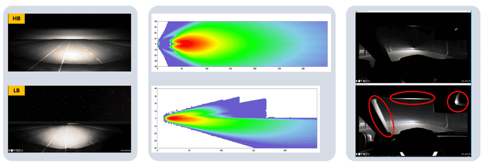 下图展示了远光灯和近光灯在驾驶员视角以及对面车辆驾驶员视角下的仿真结果,中间是光源配光曲线的仿真数据可视化效果。