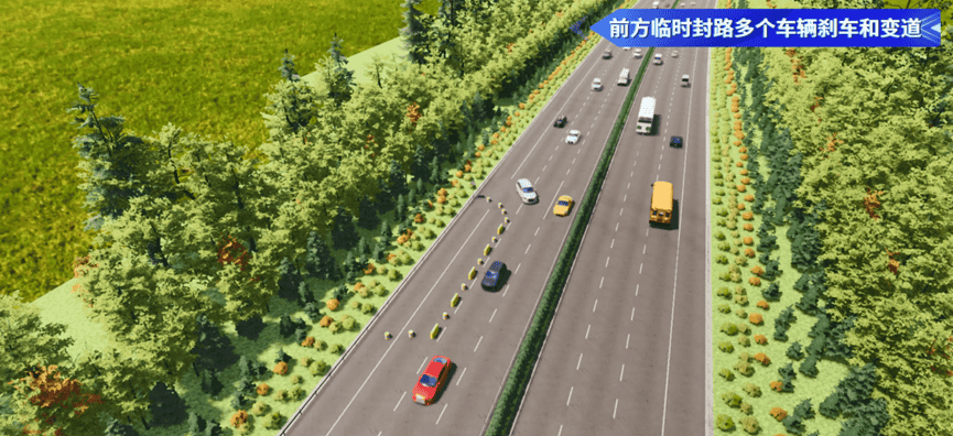 随机交通流模型(Traffic-S):内置随机交通流模型。该模型考虑了车辆之间的间距、加速与刹车行为,以及交通参与者的随机决策。这使得生成的交通流在动态特性上更加贴近实际,能够再现不同交通条件下的车辆运动特征和群体行为。用户可通过配置交通流的平均行驶速度、密度、稳定性、交通车种类比例、驾驶员驾驶风格比例、交通设施等,快速生成具有物理特性的且符合经验的交通场景。并且,该模型通过全局中观交通模型和局部微观交通模型的同步切换,最高支持10000个交通参与物的实时交通仿真。
