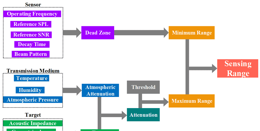 提出了一种高保真超声波传感器建模方法,可应用于虚拟智能驾驶场景。模型综合考虑了传感器特性、传播介质及目标物体的物理属性。其中,传感器特性包括超声波传感器的传输模式、灵敏度和发射方向;传播介质建模分析了大气条件对超声波传播衰减的影响,如温度、湿度和气压等;目标特性则考虑了目标物体的物理属性(如几何形状和声学阻抗)对信号反射的影响。通过时间飞行(TOF)技术计算目标距离,并评估信号衰减及噪声的影响,以确保在复杂环境下的准确性和可靠性。