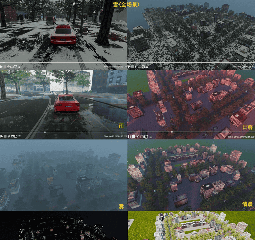 在全天候光照变化的模拟中,PanoSim支持通过控制太阳高度角模拟从清晨到黄昏的光源位置变化;支持调整光照强度和色温,模拟清晨、正午、黄昏等不同时间的光照效果;支持动态阴影仿真,可以精准模拟建筑物、地形和植被的动态阴影投射,以及阴影随太阳高度角变化的效果;支持通过动态控制脚本切换天空盒模型,实现晴天、多云、夜晚等仿真。下图是模拟光照变化条件下的场景仿真效果: