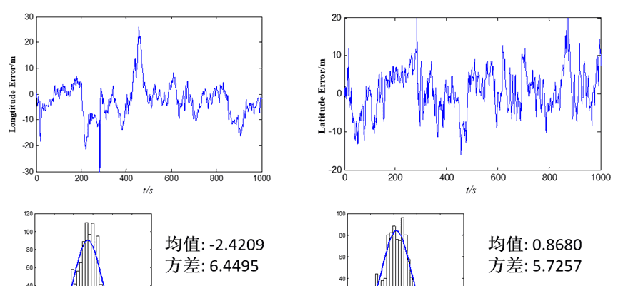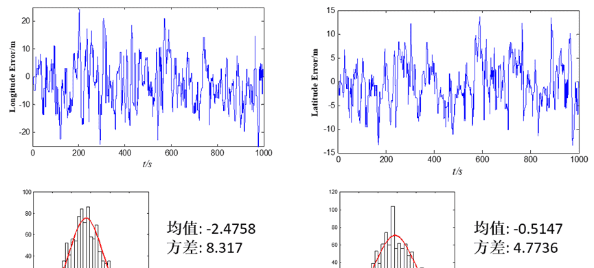 两者对比能够看出,GPS模型单点模拟的精度与实测结果非常接近,其中经纬度的均值差异性控制在±1m内,方差差异性控制在±3m内。