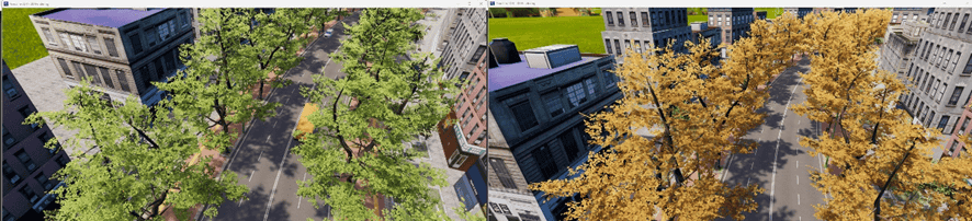 天气环境(包括天气、季节、能见度、降水、温湿度等)是影响驾驶系统的重要因素,会对车辆、通信、传感器等产生重大影响。PanoSim支持参数化的天气环境光照建模,形成逼真、动态且可调控的自然环境模拟。并且,支持通过动态控制脚本在虚拟环境中模拟天气及光照的动态变化。在季节特征模拟方面,利用渲染引擎的环境渲染模块,通过动态调整植被颜色、树木密度和环境纹理等参数来呈现春夏秋冬的特征。