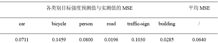 这里展示的是强度预测模型的推理结果。结果展示,在KITTI数据集的连续帧中,各类别目标强度预测值与真实值之间的平均MSE为0.064。