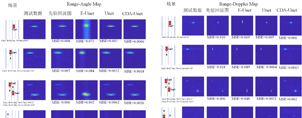 这是典型场景下的对比数据。第一列中的R-A和R-D图展示了在微波暗室中,使用真实雷达板卡接收雷达模拟器目标信号后的实测回波数据;第二列是通过光线追踪计算得到的理论回波模拟数据;最后一列是PanoSim的毫米波雷达白盒模型的回波模拟数据。能够看出,在大多数测试场景下,PanoSim的毫米波雷达模型能够反映目标回波区域扩散,且其扩散分布与实测数据高度吻合,其回波精度相较于光线追踪计算的回波数据,MSE误差可降低至原来的1/10左右。