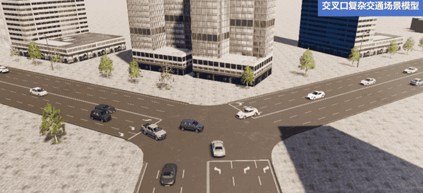 交叉口模型(Traffic-C):该模型采用层级化场景动力学方法实现交叉口复杂场景建模。首先通过场景要素解构,将场景分解为道路结构层、动态交通层与静态设施层,解析各层元素间的耦合机制。基于多体动力学理论,将交叉口抽象为刚体交互系统:以期望速度生成车辆运动的驱动势能,通过安全距离模型构建车-车排斥力场,依托交通规则约束建立车-路边界势场。三类力学关系通过牛顿-欧拉方程统一描述,构建车辆运动状态微分方程组并求解。目前,该模型能够实现百辆级交通流的毫秒级状态更新。模型已适配丁字路口、十字交叉口、X型枢纽及环岛等含有交叉口的道路拓扑结构,支持车道级转向规则、信号灯相位控制等精细化约束。