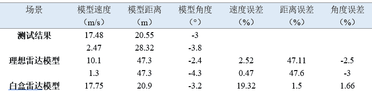 下表展示了模型回波信号接入共同的雷达目标识别算法,产生目标列表的结果。可以看出,PanoSim的毫米波雷达模型预测值相对雷达检测值的误差基本都在5%以内。该结果明显优于基于光线追踪的理想雷达模型,证明了PanoSim的毫米波雷达白盒建模方法建立的模型可以在仿真系统中实现高精度的预测结果。