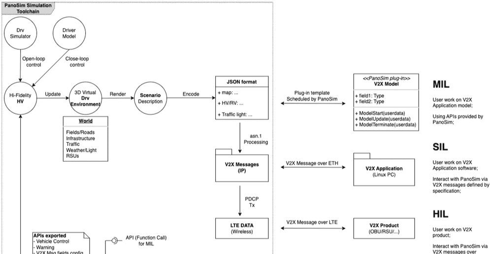 PanoSim-V2X设计了三种“开发对象接入”方式,以应对不同产业链分工和用户需求的差异。MIL(Model in the Loop)针对算法开发用户,提供plug-in架构和算法开发模板,使用户集中于算法实现,无需关注底层硬件和软件工程化。SIL(Software in the Loop)接入适用于软件开发用户,允许他们使用类似最终操作系统的平台(如Linux)进行V2X算法转换,同时支持V2X Message over ETH和GNSS更新的交互,简化了V2X底层通信模块的需求。HIL(Hardware in the Loop)面向产品开发和测试用户,与实际硬件和软件平台结合,实现V2X Message和车辆状态等的互动,确保与真实车辆环境一致。这三种接入方式体现了一种渐进式一体化开发手段,符合汽车行业V开发模型,便于行业从业者理解和应用。