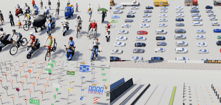 在虚拟资产方面,PanoSim内置丰富的3D模型资产库,涵盖车辆(包括机动车、非机动车、特种车辆等)、行人、交通设施、动物、静态障碍物等五类对象。所有模型均包含LOD(Levels of Detail)结构。资产库支持PBR(基于物理的渲染)材质系统,通过粗糙度、金属度、法线贴图等参数实现真实表面反射特性,满足摄像头、毫米波雷达、激光雷达等多模态传感器的多波段仿真需求。