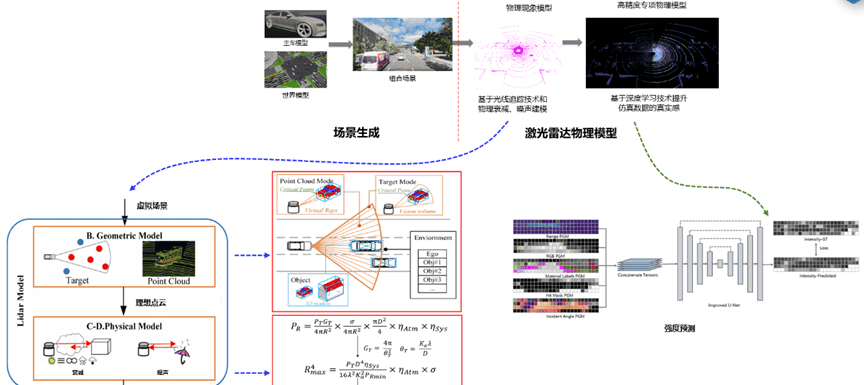 PanoSim研发了基于物理数据双重驱动的激光雷达模型,模型将点云生成分为物理现象级点云生成以及数据驱动的点云生成两部分。