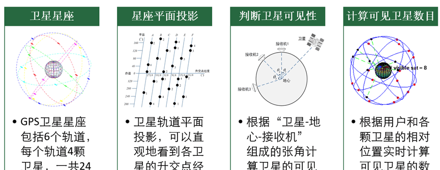 研发了高精度的GPS模型。GPS通过卫星发射无线电信号,接收机接收并计算每颗卫星到接收机的距离,从而解算出接收机的位置。该模型考虑了影响最终定位结果的关键因素,如卫星星历,卫星遮挡模型及误差模型。
