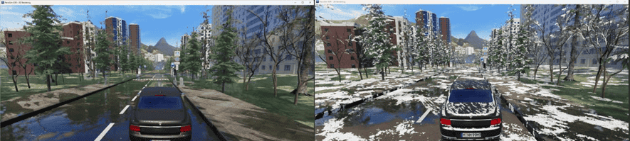 在降水模拟中,PanoSim通过粒子系统精确再现降雨和降雪等自然现象。用户可通过参数化设置粒子属性,进行高度定制化。例如,针对降雨效果,可调整降雨量、雨滴下降速度、降水方向及粒子尺寸分布,从小雨到暴雨等不同情景;对于降雪效果,用户可调节雪花形态、下落速度和风向,模拟雪花随风飘落的动态过程。此外,平台还支持模拟雨水积聚后水洼的反射效果、雪花堆积形成积雪等物理交互,进一步提升降水模拟的真实感,并提高传感器仿真数据的精度。下图是模拟降水、降雪的场景仿真效果: