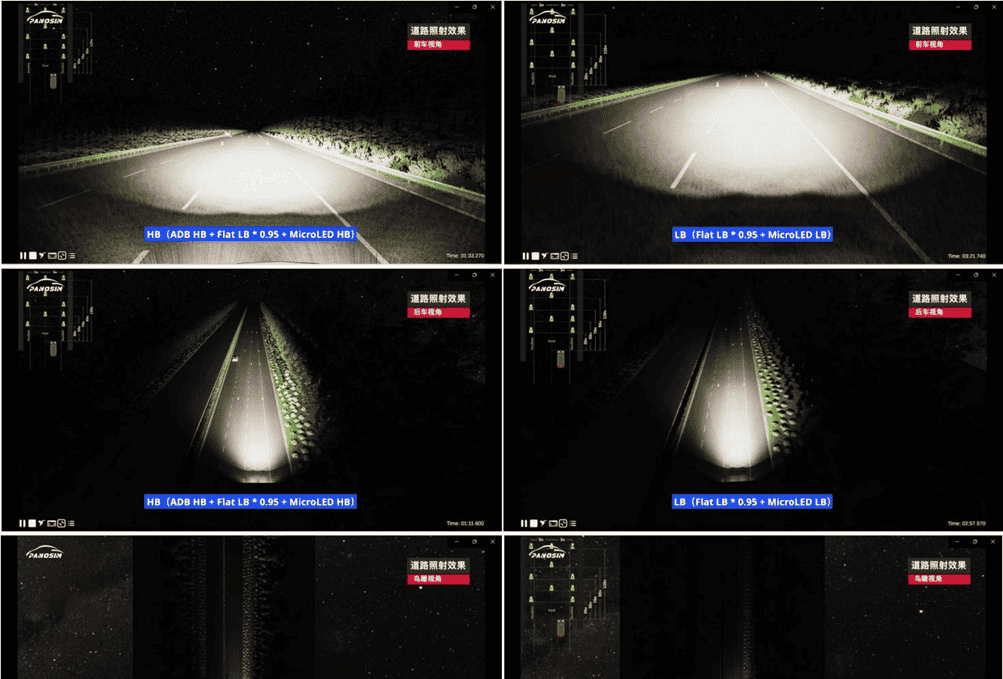 下图第一行从左到右分别为 HB的后车高空视角、前车视角、鸟瞰视角,3张车灯仿真效果图。第二行从左到右分别为HB/ADB激活状态下关闭某些扇区时候(左前方放置了一部对手车)的仿真效果图片。能够看出,在对手车出现后,ADB功能激活自动关闭扇区,防止对对面车辆驾驶员造成眩晕干扰。