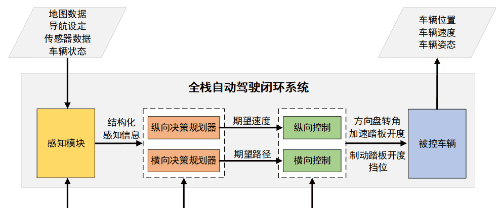 智能型驾驶员模型的感知、决策规划和控制子系统采用顺序结构相互衔接。感知模块的上游为原始传感器信号,如相机反馈的图片和激光雷达提供的点云信号,感知模块处理后的结果传递给决策规划子系统。决策规划模块根据感知数据输出决策信息,传递至控制子系统。控制子系统最终输出方向盘转角、加速踏板开度、刹车踏板开度和挡位信号等参数,用于精准控制车辆的运动。