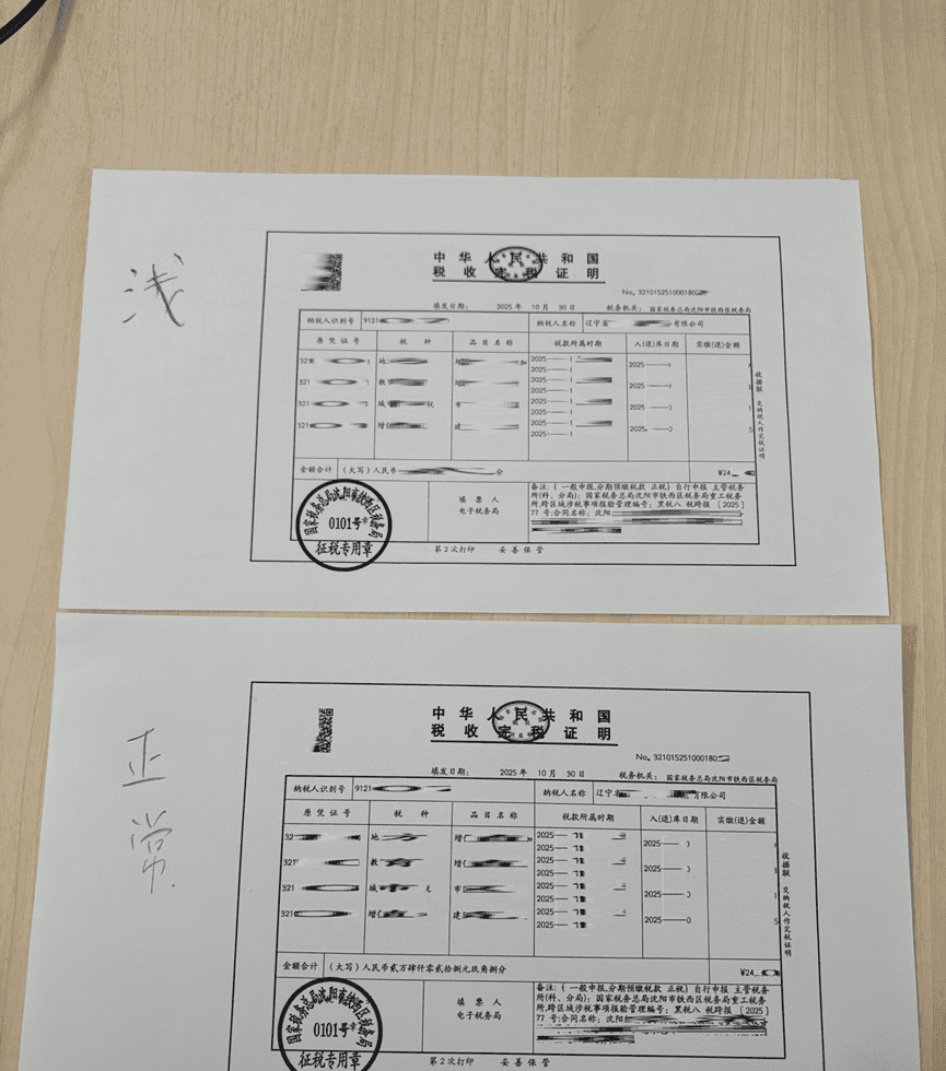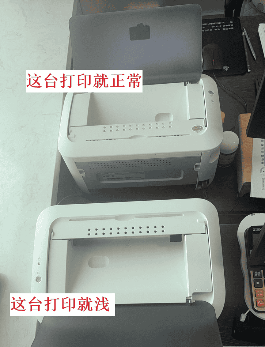 一台佳能LBP6018L黑白激光打印机,新机器,刚拆箱,用户使用才几天,用户在使用过程中发现这台LBP6018L黑白激光打印机打印出来的文档有点浅,怎么发现的呢?用户是财会公司人员,同办公区的同时用的都是佳能的这款LBP6018L黑白激光打印机,对桌同事的那台佳能LBP6018L黑白打印机打印出来的文档字体的颜色粗细就很重,用户经常打印的一般就是A4文件各种资产负债表了,A5纸打印各种发票、票据类的;尤其是A5打印的发票类文件,相同的两台机器对比下来就很明显这台新机器就浅淡很多,而且文字笔画细;具体样式如下图: