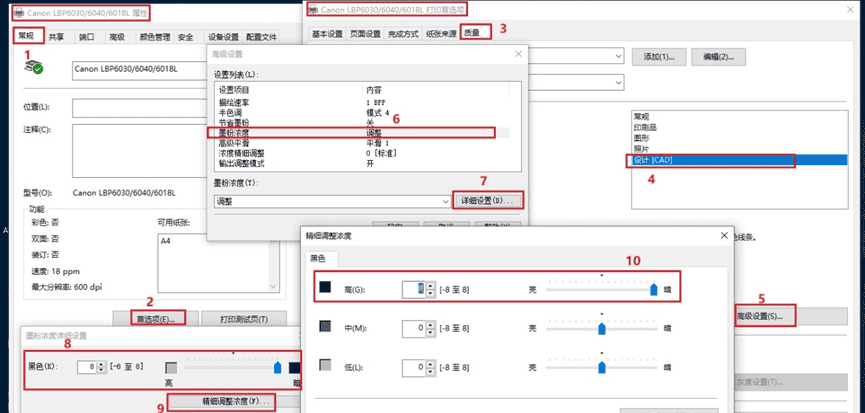 在打印机属性中,依次点击【首选项】,然后在【打印首选项】中点击【质量】,在【质量】中选择【设计{CAD}】,然后再点击【高级设置】,在【高级设置】中选择【墨粉浓度】,【墨粉浓度】选择【调整】,然后再点击【详细设置】,在【墨粉浓度详细设置】中将【黑色】调至【最暗{8}】,然后在选择【精细调整浓度】,在【精细调整浓度】中将【高】调至【最暗{8}】,然后点击【确定】,再点【确定】,再点【确定】,然后点击【应用】和【确定】;