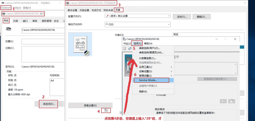 还是在【打印机属性】中点击【首选项】,然后在【打印机首选项】中点击【质量】,在质量中点击上图中标注的【第4步那个图标】(应该是打印机的信息设置之类的吧),这时候出来了一个打印机的信息页面,在这个页面中用键盘敲【*28*】后,在点击【选项】,在【选项】中点击【Service Mode…】;