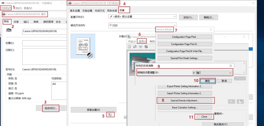 在弹出来的【Service Mode】菜单中点击最下面倒数第二行写着【Special Density Adiustment…】的这个菜单,点击完之后会弹出一个【特殊的浓度调整】菜单,然后我们将【特殊的浓度调整】调节成-8,也就是【8{暗}】调完之后点击【确定】,然后再点击【Close】,再点击【应用】和【确定】;