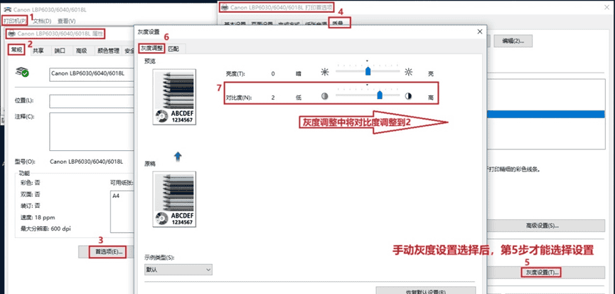 还是在【打印首选项】中点击【质量】,选择【手动灰度设置】,再点击【灰度设置】,在【灰度设置】中将【对比度】调至【高 2 】,调完之后点击【确定】,然后点击【应用】和【确定】;