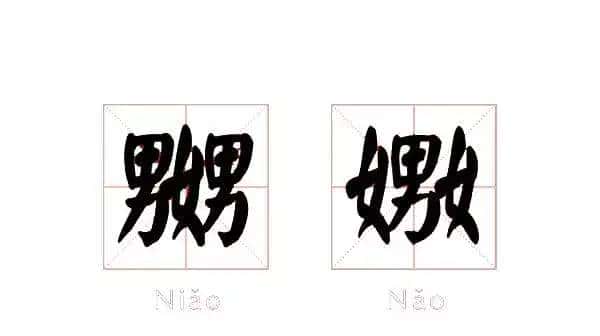 九:嫐=女+男+女,读niao<第三声>,意即戏弄,但在地方方言中有娇媚之意,在粤语中也指长辈对晚辈的喜爱、挑逗之意。