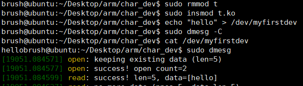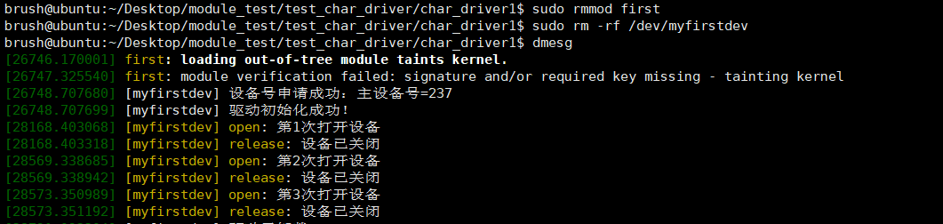 测试用户向内核写数据,我把前面的myfirstdev从dev中删除了,重新用maknod创建的与案例二适配的myfirstdev,在执行之前,我用cat打开了2次了,所以下面会显示open count=3: