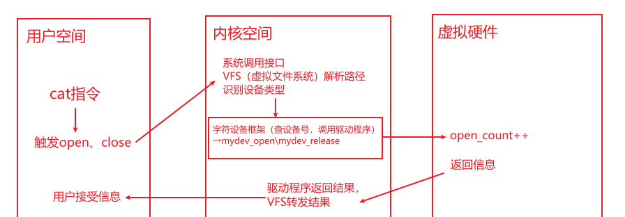 用户空间通过设备节点发起操作 → 内核空间驱动接收并处理 → 驱动与 “虚拟硬件”(内核内存中的软件模拟逻辑)交互 → 结果返回用户空间。